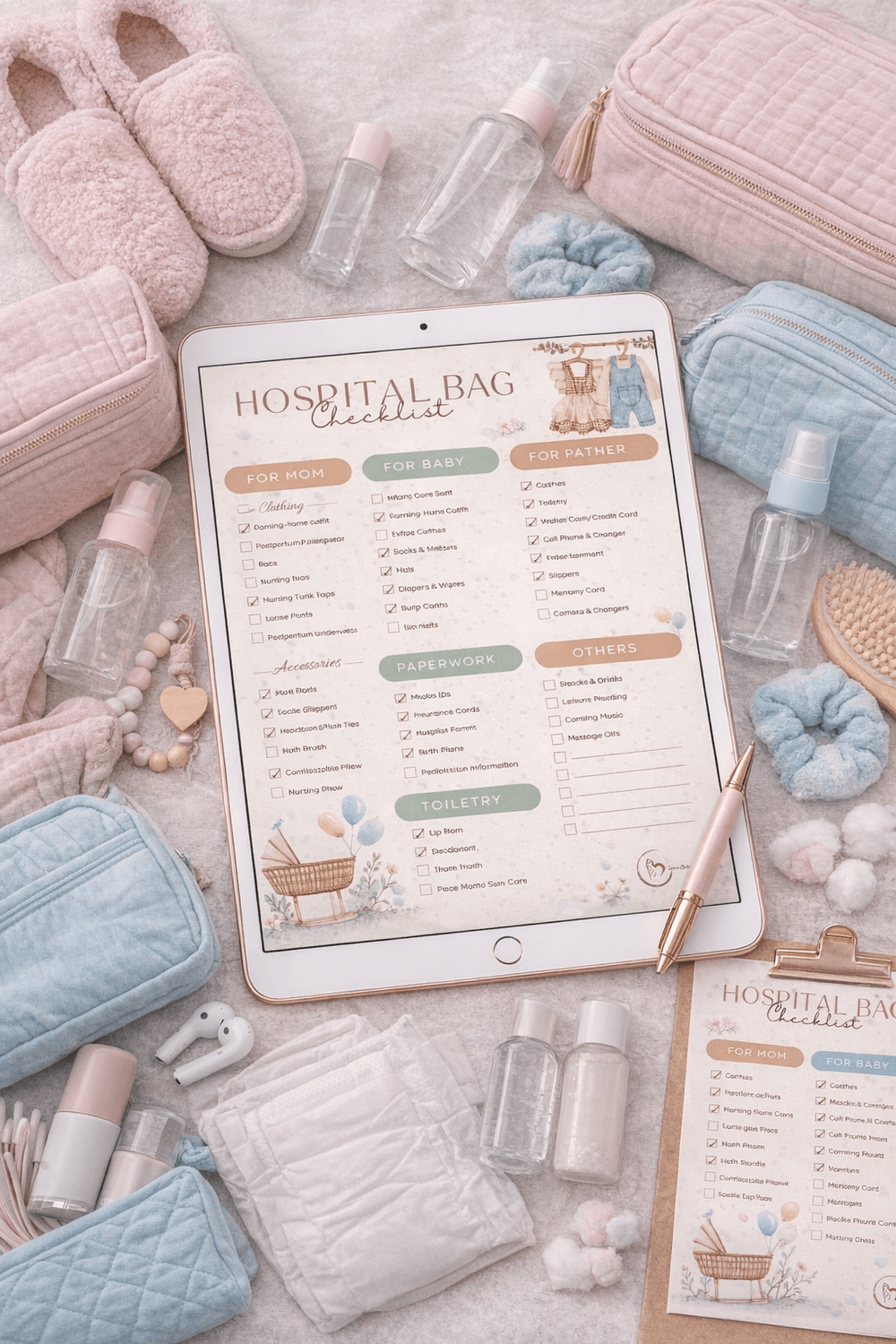 This beautifully designed, printable checklist shows you exactly what to bring for mom, baby, and partner, organized into clear categories so nothing important is forgotten.