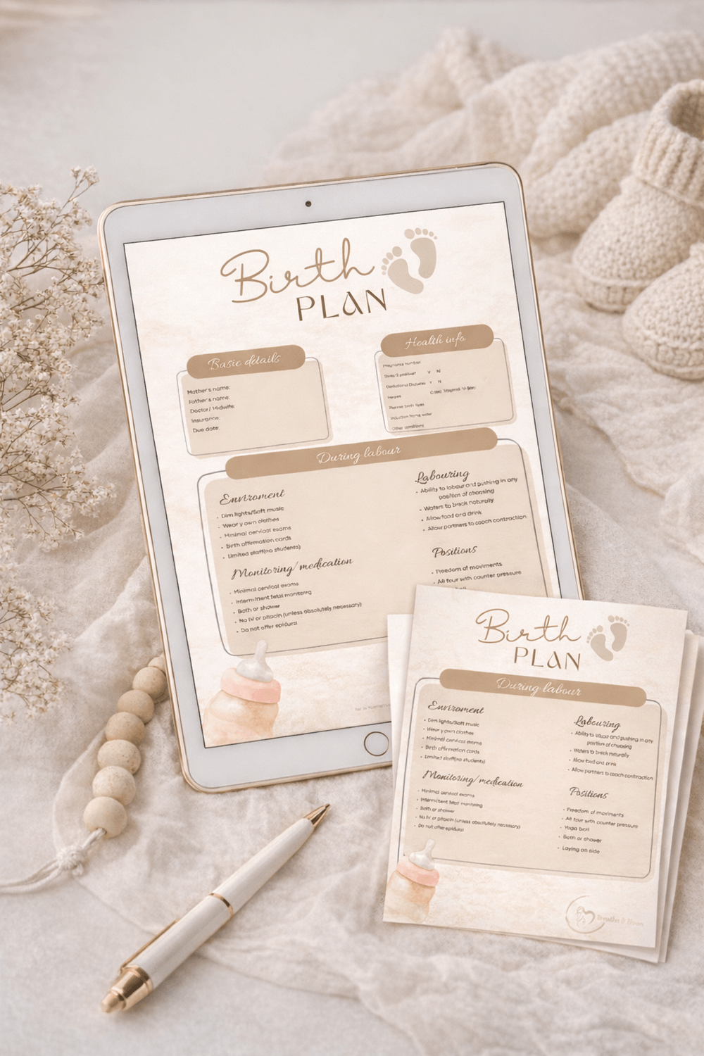 A beautifully structured, pre-filled birth plan that helps you define every detail of your birth labor environment, medical preferences, freedom of movement, wishes for the moment of birth, cesarean plan, the golden hour, and newborn care choices. Print it. Bring it to the hospital. Your medical team will know exactly what you want.